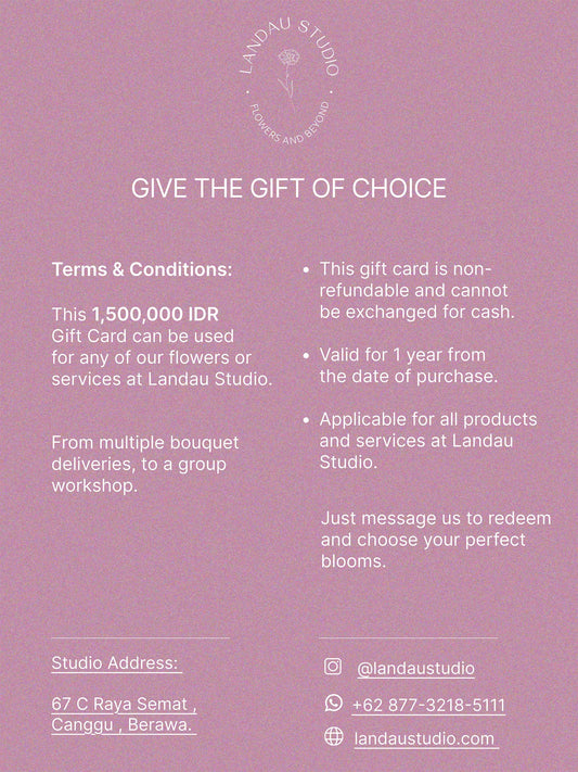 Order your Landau Studio Flower Gift Card today — visit our flower studio in Berawa, Canggu, or enjoy convenient flower delivery anywhere in Bali.