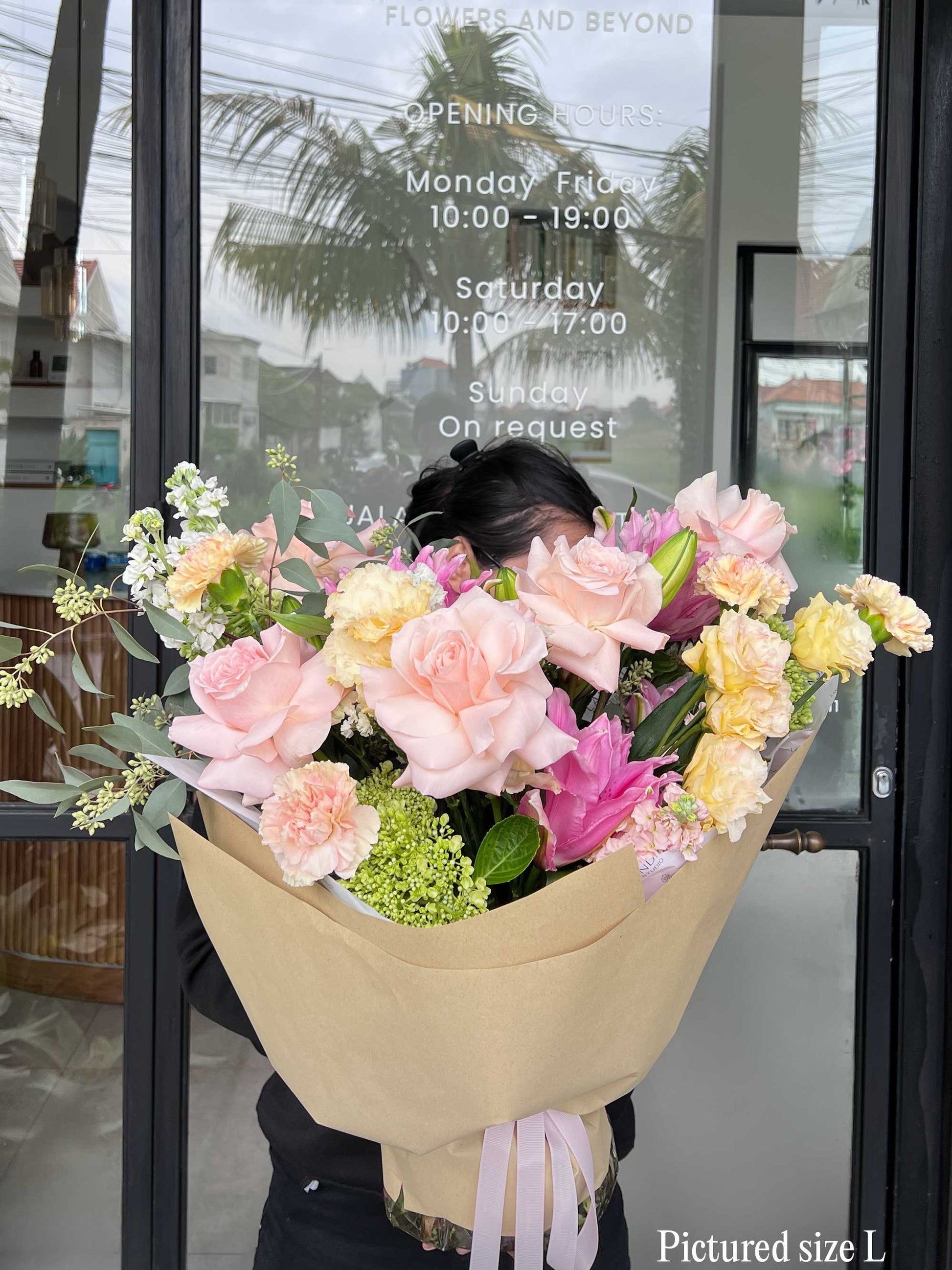 Soft, dreamy, and delicately beautiful — our Pastel Flower Bouquet features a gentle blend of premium flower in blush, white, cream and light peach tones. Ideal for birthdays, baby showers, or heartfelt gestures. Made with a mix of imported and local flowers, and available in 3 sizes to suit your budget. Same-day delivery available in Canggu and other areas in Bali.