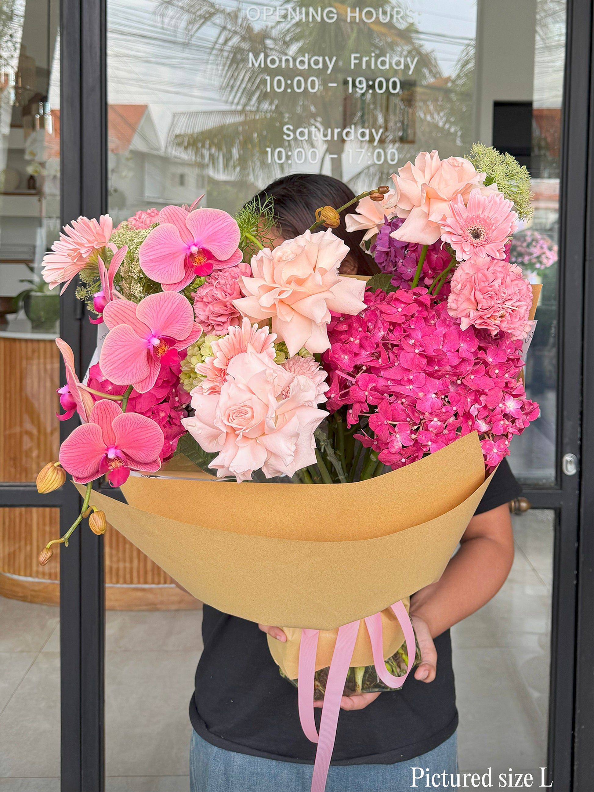 Cheerful, vibrant, and full of beauty— our Bright Flower Bouquet brings a burst of color to any occasion. Made with a joyful mix of imported and premium local flowers, it’s perfect for birthdays, congratulations, or simply to brighten someone’s day. Choose from 3 sizes to match your style and budget. Same-day delivery available in Bali.