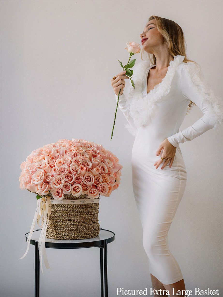 A statement arrangement of mono Holland roses in pastel tones, available in a woven basket or signature box. Designed in Bali for International Women’s Day, this piece offers a fuller and more structured presentation.
