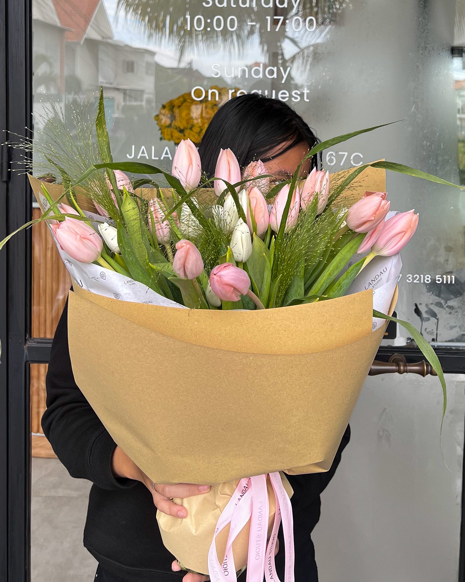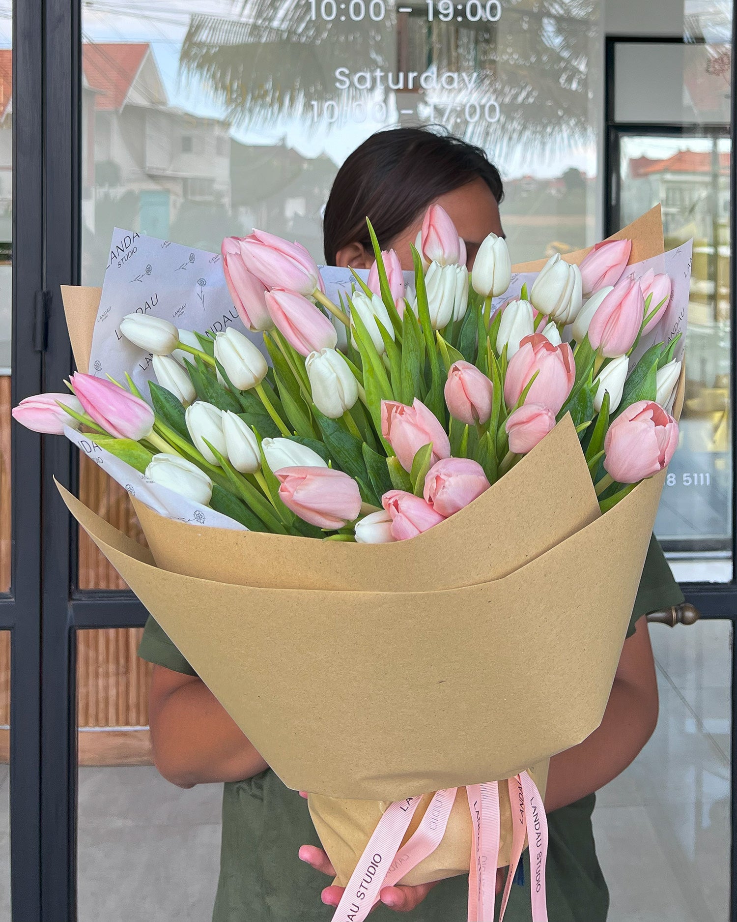 Celebrate the beauty of spring with our stunning tulip bouquet, available in white, pink, peach, and lavender. Symbolizing love, grace, and new beginnings, these fresh blooms make a perfect gift for any occasion. This toulip bouquet brings a touch of elegance and charm to any space. Ideal for gifts, celebrations, or simply to brighten someone's day, our tulips in Bali are a timeless choice for flower lovers.